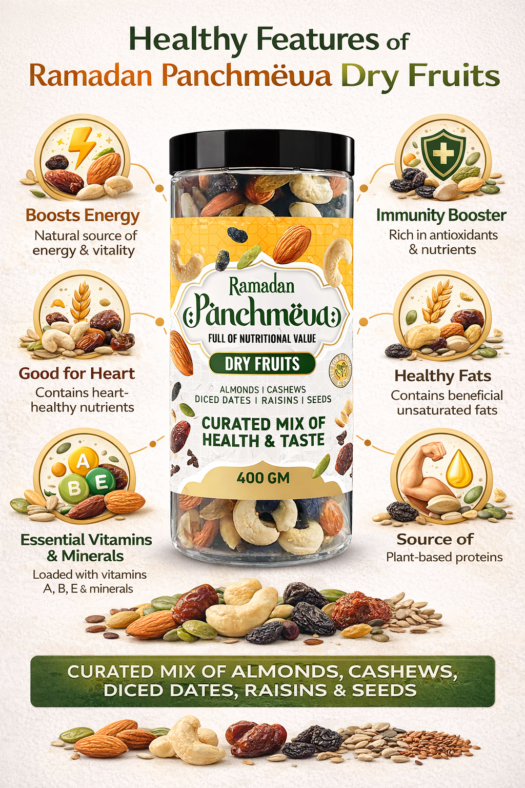 Elevate your snacking with our Premium Panchmeva Dry Fruits 400g – a traditional Indian “five fruits” mix (Panchmeva) crafted for taste, nutrition, and wellness. This wholesome blend features handpicked Almonds, Cashews, Diced Dates, Raisins, and Seeds – delivering a perfect balance of crunch, chewiness, and natural sweetness. Sourced for purity, this nutrient-dense trail mix is ideal as a healthy everyday snack, post-workout fuel, or festive prasad offering.